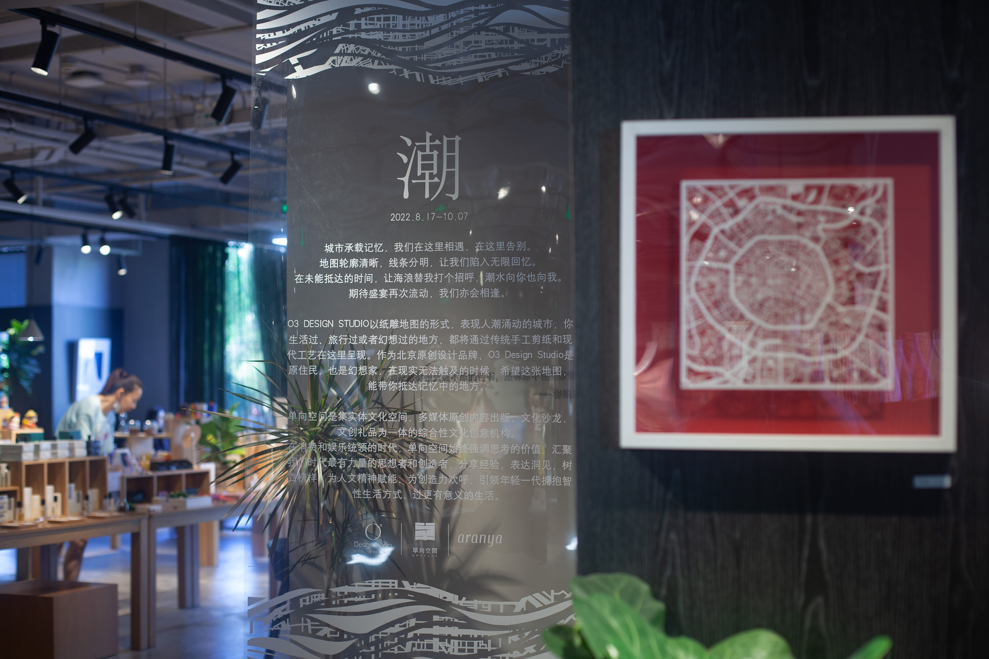 潮,2022.8.17-10.7 O3 DESIGN STUDIO以纸雕地图的形式,表现人潮涌动的城市,你生活过、旅行过或者幻想过的地方,都将通过传统手工剪纸和现代工艺在这里呈现。 作为北京原创设计品牌,O3 Design Studio是原住民,也是幻想家,在现实无法触及的时候,希望这张地图,能带你抵达记忆中的地方。 策展人:阿拉 主办单位:O3 DESIGN STUDIO x 单向空间 x 阿那亚(品牌logo)